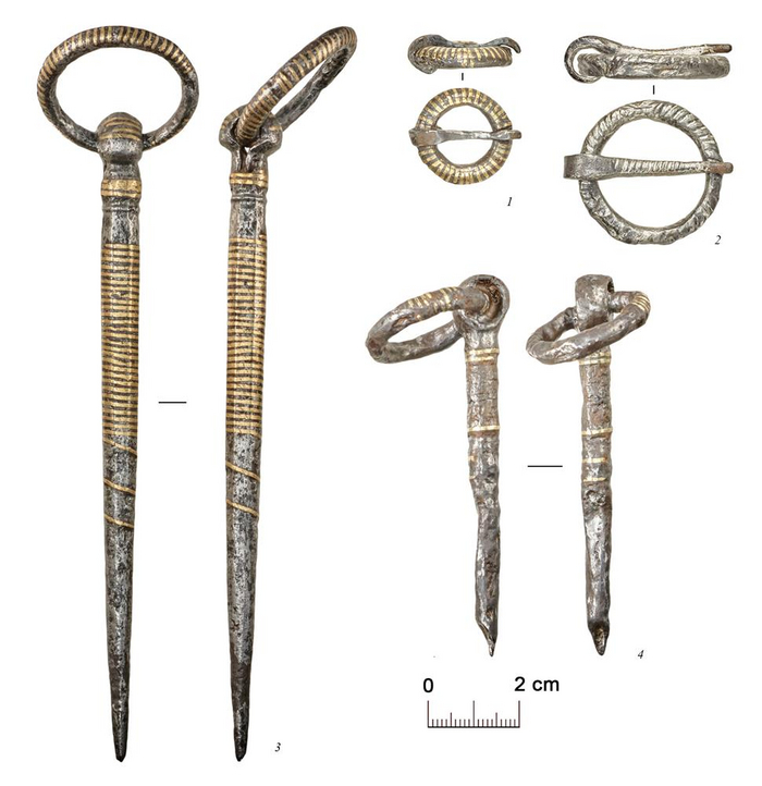 Железные изделия с инкрустацией: 1, 2 – пряжки; 3,4 – стержни