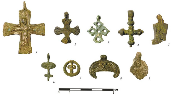 1–4 – крестики-тельники, 5 – фрагмент створки энколпиона, 6–9 – подвески