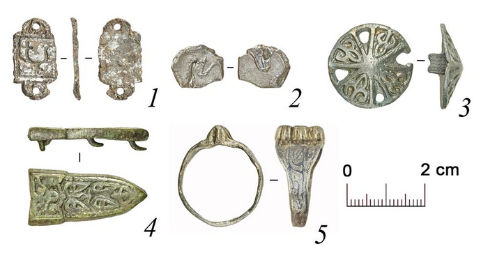 Ювелирные изделия: 1 – накладка, 2 – свинцовая пломба, 3 – пуговица, 4 – наременная накладка, 5 – перстень