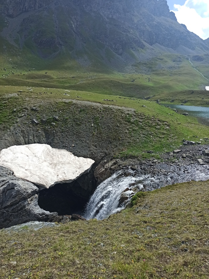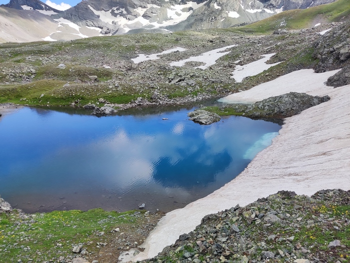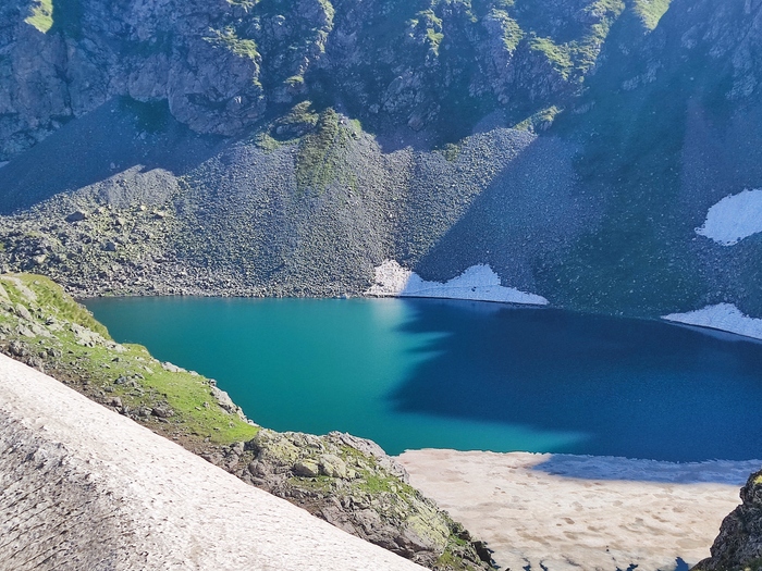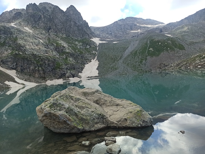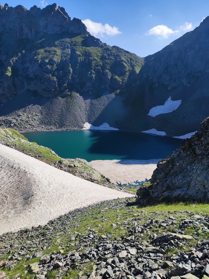 Со стороны перевала в озеро спускается снежник. И, что интересно, снег и лед не только над водой. Но и в воде застыла глыба льда...