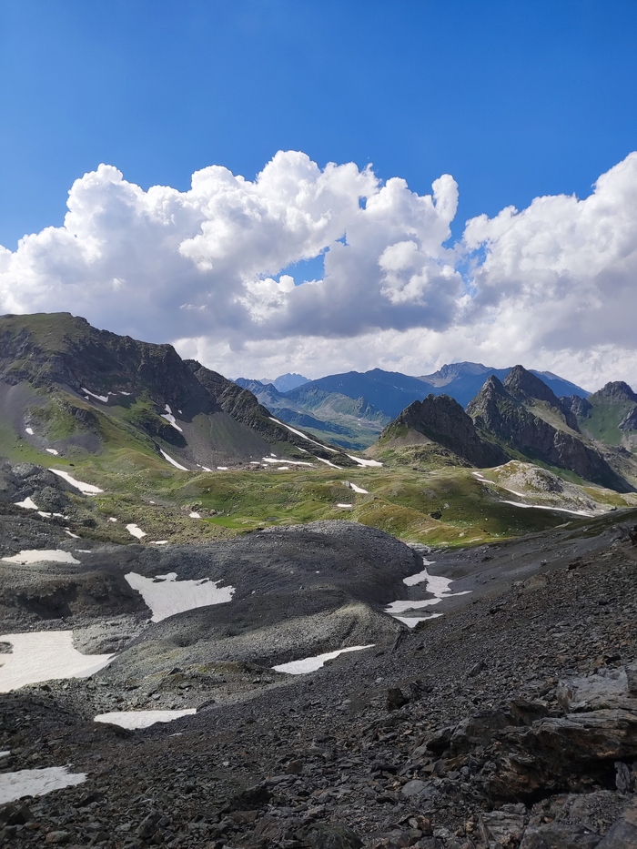 С перевала Агур, а особенно чуть ниже его, там где ветер уже не пытается сдуть тебя с ног, можно полюбоваться видом на Турье плато и перевал Мылгвал. И даже на соседний горный цирк, проглядывающий через выемку перевала.