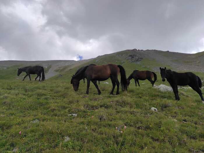 И наконец-то доходим до табуна лошадей, пасущихся на альпике. Табун большой. Но близко к нему подходить опасно. Жеребцы нервничают, демонстрируют неудовольствие.