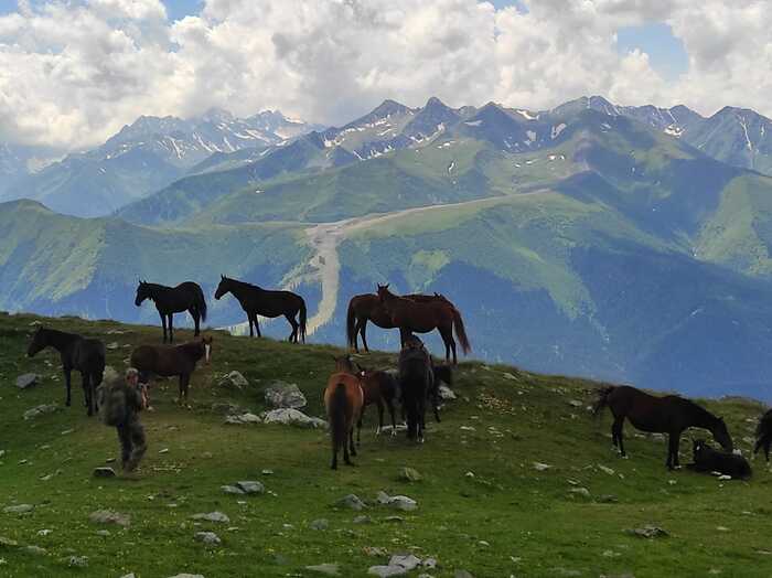 Мы поторопились уйти. А храбрец из группы, спускавшейся вниз, бесстрашно пошел фотографировать табун.