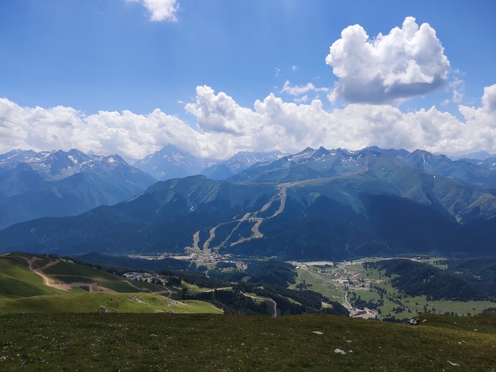 Вот так выглядит склон хребта Абишира-Ахуба от станции канатной дороги "Млечный путь". Здесь еще зелено. А чем выше, тем меньше растительности и камни, сплошные камни... И снежники, конечно...