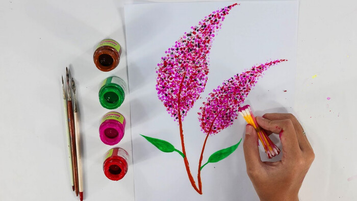 Рисуем сначала кисточками траву, стебельки цветов и листочки. Когда они подсохнут, далее работаем ватной палочкой. Обмакиваем ее кончик в краску и ставим точки между стебельками там, где мы хотим нарисовать цветки. Чтобы отпечатки получились ровными и круглыми, ватную палочку нужно держать вертикально и хорошо прижимать к листу.