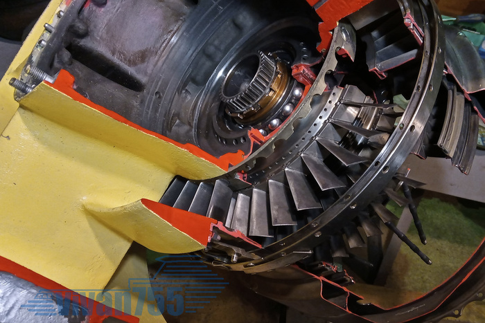 А ближе к переднему концу стоит межвальный подшипник (МВП), через него на турбину низкого давления опирается турбина высокого. Смазка к нему подаётся через трубку внутри вала. Чтобы показать её – режу вад, вот он уже разрезанный и вставленный в опору, стрелкой показано отверстие подачи масла к МВП: