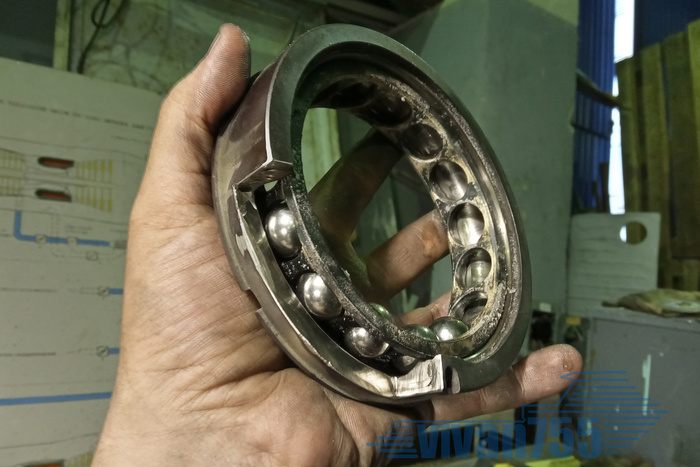 А вот на вал уже натянуты графитовые уплотнения, внутренняя обойма МВП и всё это стянуто гайкой (медного цвета, слева на валу):