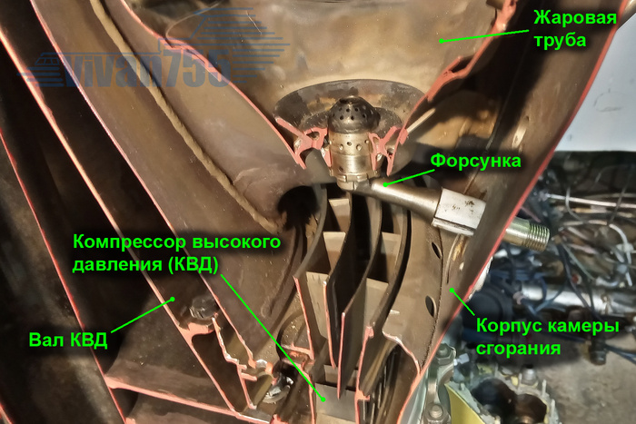 Вот он в сборе с валом ТНД, в окне по центру видны шлицы вала ТНД, через которые крутящий момент передаётся соединительному валу: