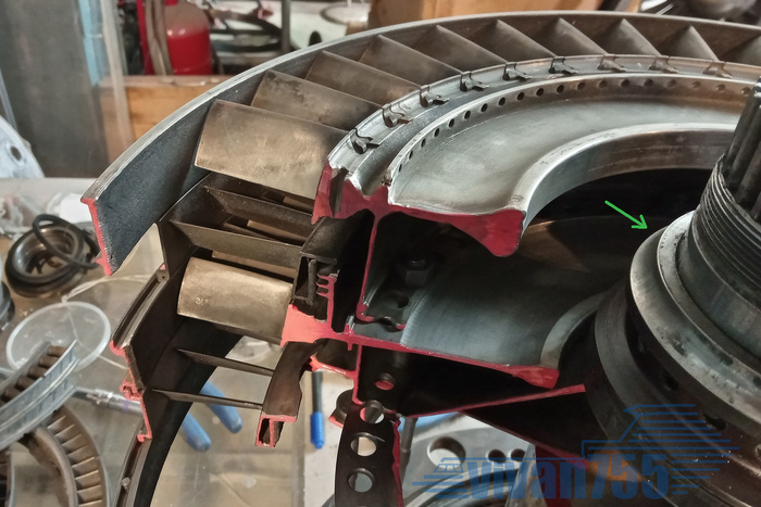 Там мы добрались до турбины высокого давления (ТВД). Это первое, что встречают горячие газы на выходе из камеры сгорания. Чтобы они влетали в лопатки ротора под нужным углом – перед роторными лопатками стоят статорные, они же направляющие, они же сопловой аппарат. Вот они, показаны стрелкой: