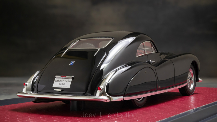 Такие элементы, как обтекаемые каплевидные крылья, закрытые передние и задние колёсные арки, центральный стабилизатор на крышке багажника и V-образное лобовое стекло тоже уже применялись Figoni&Falaschi. Большая часть красоты этого Delahaye также проявляется в таких деталях, как хромированные вставки, подчеркивающие изгибы, встроенные в крылья указатели поворота и полоски по бокам, которые создают ощущение скорости и скрывают дверные ручки.