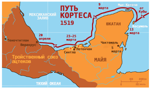 Когда Кортес покидал Кубу, его переводчиком был майянский раб по имени Мельчиор, практически не говоривший на испанском. Несмотря на это, Кортес узнал от дружественного местного населения, что на Юкатане живут его соотечественники. Кортес через рабов направил письмо вождю по имени Ташмар.