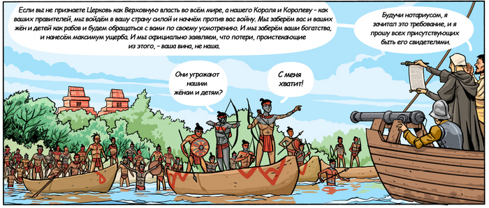 "Требование" (Requerimiento) - это объявление о суверенитете и о войне. Испанские солдаты зачитывали его коренным жителям Америки, часто даже без переводчика. По сути - "кто не с нами, тот под нами".