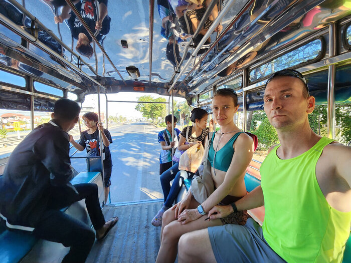 Тайцы пешком не ходят. В другой раз наш друг решился пройти с нами 800 метров до дома, по пути рассуждая о необходимости взять такси. Когда мы подошли, он сначала зашёл в 7/11 за напитком, объясняя что он очень устал от пройденного пути. Мы, привыкшие в среднем ходить по 15 км ежедневно, долго этому удивлялись, но сейчас понимаем почему. В Бангкоке у нас были условия для прогулок, хотя периодически выходили на участки, где нужно идти по проезжей части. В других же городах обстоятельства сложнее. Можно гулять по набережной вдоль моря, но по утрам будьте готовы отбиваться от уличных собак. Добираться до этой набережной пешком придётся по дороге без тротуаров и с ещё более злобными собаками. В городе Трат нас гуляющих по обочине чуть не сбила дама в тёмное время суток на скутере с выключенной фарой.