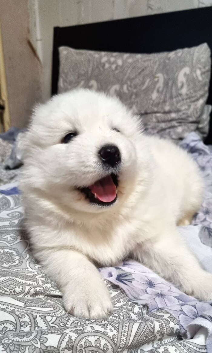 Сегодня заводчик скинул с утра эту прелесть. Самая маленькая по размерам девочка в помете решила хоть в чем-то всех обогнать и первая открыла глазки)