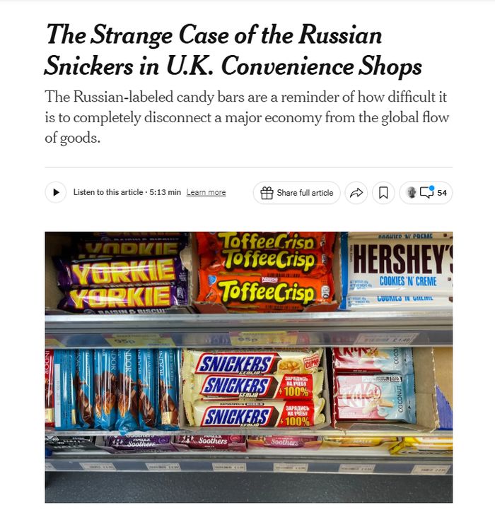 Большинство продуктов питания не подпадают под действие санкций, но Россия отреагировала на это, запретив экспорт многих продуктов питания в Европу и другие страны. Присутствие конфет с российской маркировкой рядом с остальными кондитерскими изделиями в Лондоне напоминает о том, как сложно полностью отделить крупную экономику от глобального потока товаров.