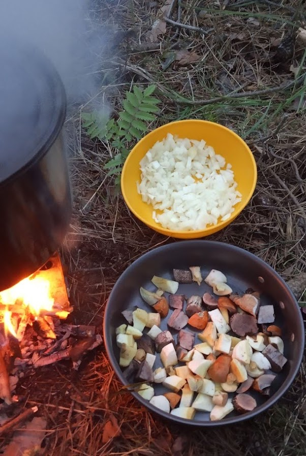Уже в сумерках Ирина кочегарит со щепочницей, я развожу рядом костёр для тепла и медитации.
