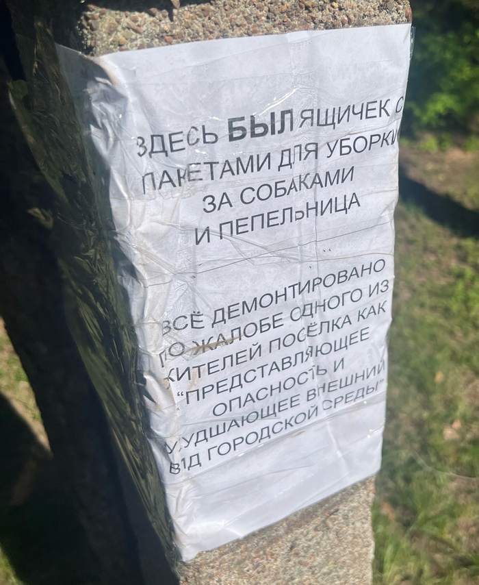 а может кто из предыдущих, но в жалобе написано и про камеру, и про пепельницы, и про пакеты, как посторонние предметы на столбах, очень вредные и опасные.