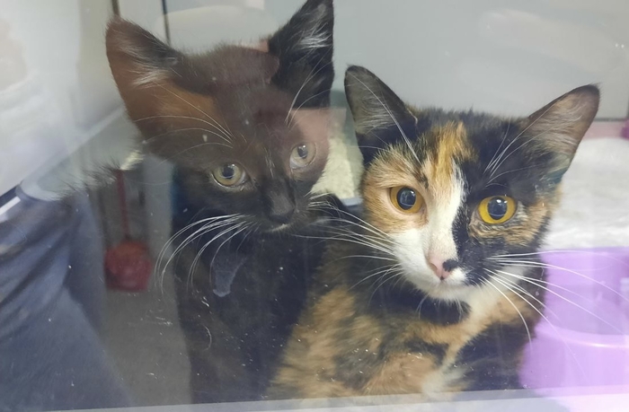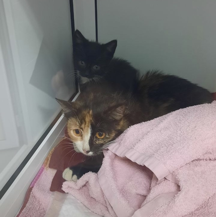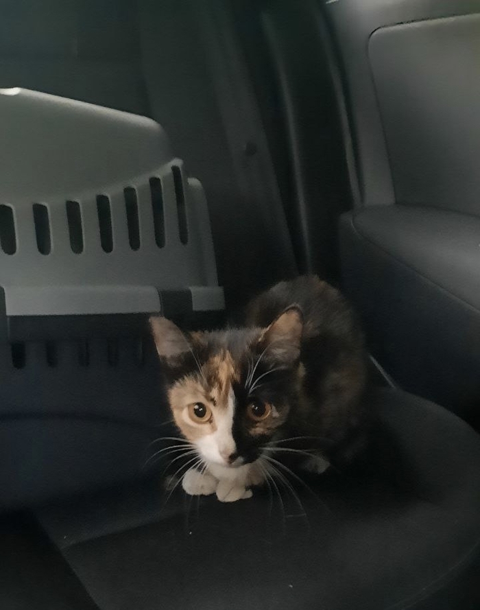 В этот же день поймать их не удалось. Точнее, кошку ещё можно было взять в руки, но котёнок та ещё пуля. С третьего раза, когда он подошёл к еде, удалось схватить и запихнуть в переноску. Кошка после этого не сопротивлялась вообще. Отвезла их в клинику, так как дома уже и так два кота, хоть и привитые, но лучше перестраховаться.