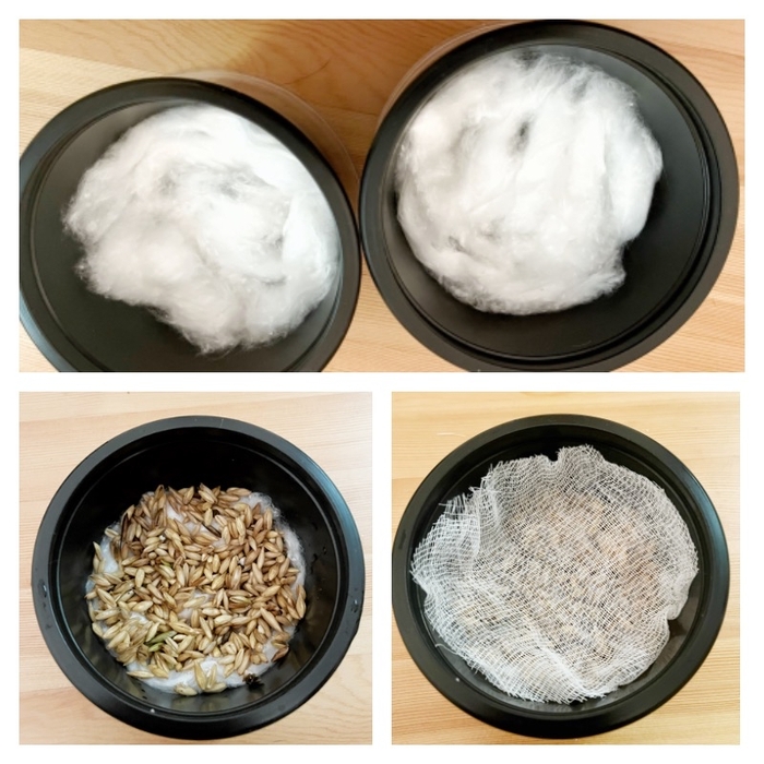 На дне плошки делаем несколько дырок, закладываем вату и сверху распределяем вымоченное зерно. Брызгаем сверху обильно из пульверизатора, чтобы и вата намокла. Накрываем марлей.
