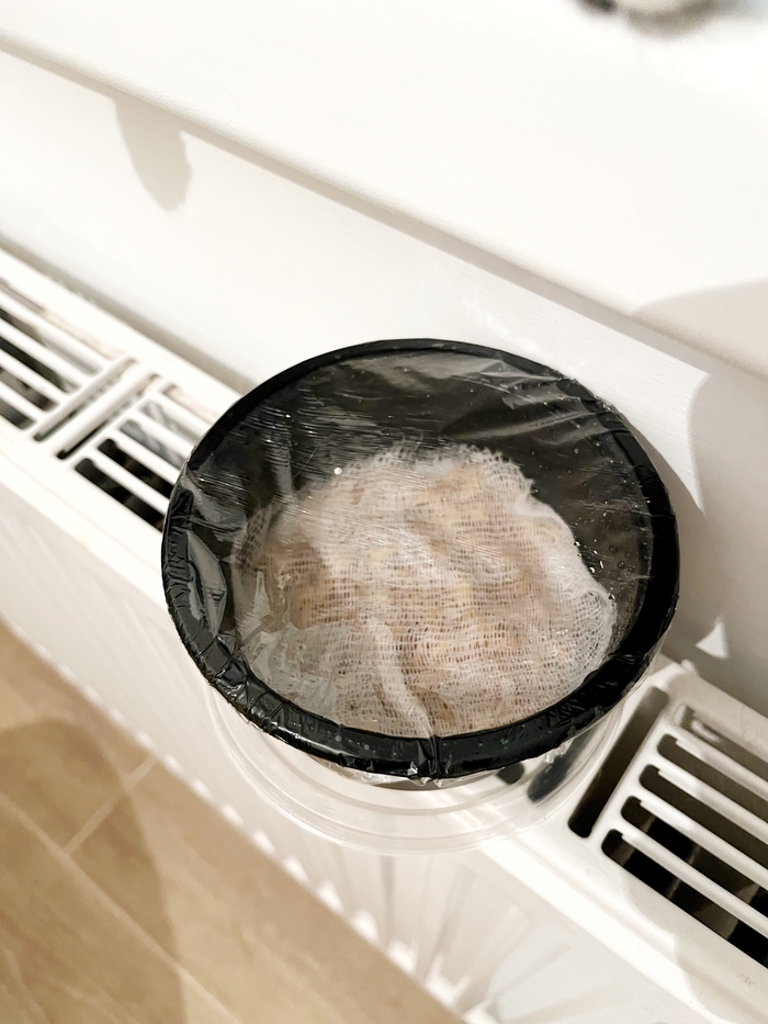 Накрываем пищевой плёнкой и отправляем париться на батарею. Если дни солнечные, то можно сразу на подоконник. В Москве, увы, таких маловато.