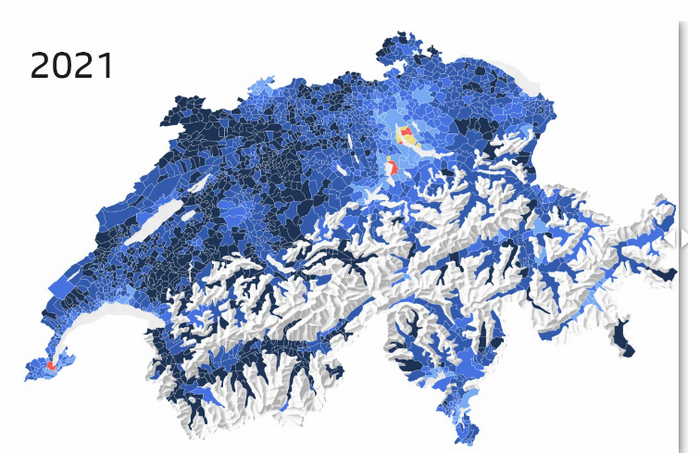На сайте srf.ch 1 сентября 2022 года вышла интересная статья про разность цен аренды и покупки жилья в зависимости от муниципалитета (там есть интерактивная карта, где можно поиграться на всей территории Швейцарии). Основной лейтмотив был: стоимость жилья растёт (оу май!!!), стоимость аренды тоже растёт, но не так быстро, поэтому во всё большем количестве муниципалитетов выгоднее снимать жильё, чем его покупать. Причём есть ощутимая разница между тем, что было год назад и сейчас (чем "синее", тем покупать дешевле, чем "краснее", тем покупать дороже):