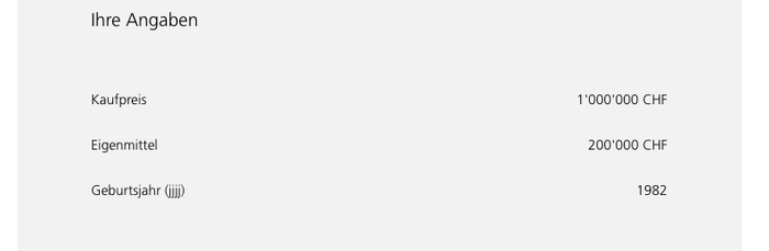 Здесь для примера я рассчитал на сайте местного Почта-Банка (Postfinance) расклад по жилью за 1 млн. фр. (62 млн. руб), с учётом необходимых 20% задатка (200 тыс. фр. или 12,5 млн. руб) и ипотекой на 15 лет под 5%: