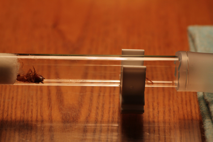 Круентатусы переселились из подтопленной пробирки сначала в соединительную трубку, там, видимо, было посуше, чем в новом инкубаторе. В этой трубке они и провели ночь, в эту же ночь разделались с тараканом, оставив один хитин на утро.