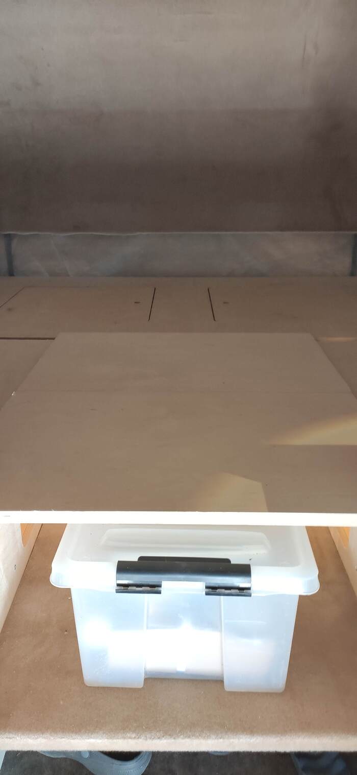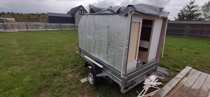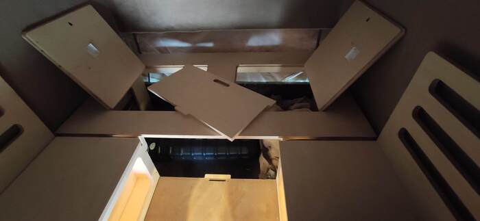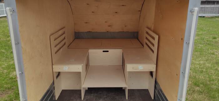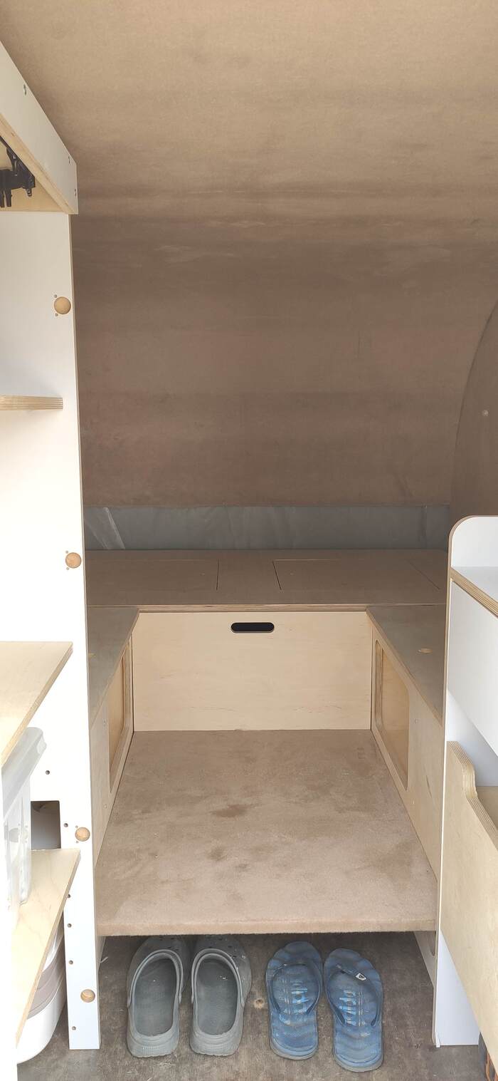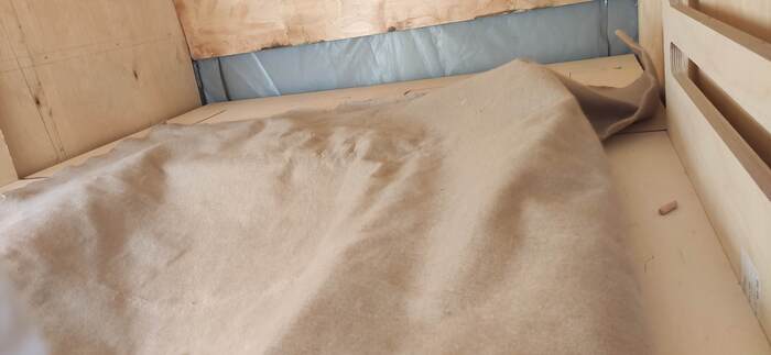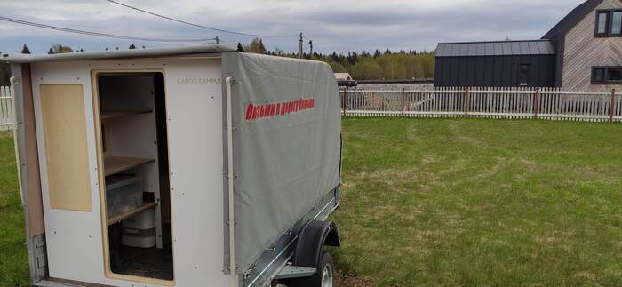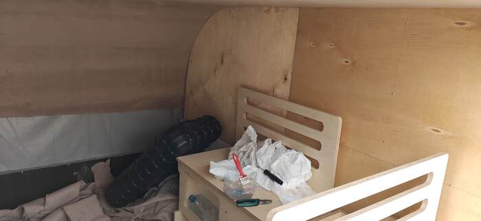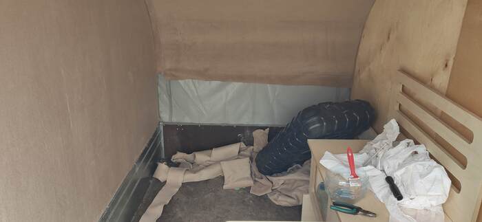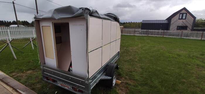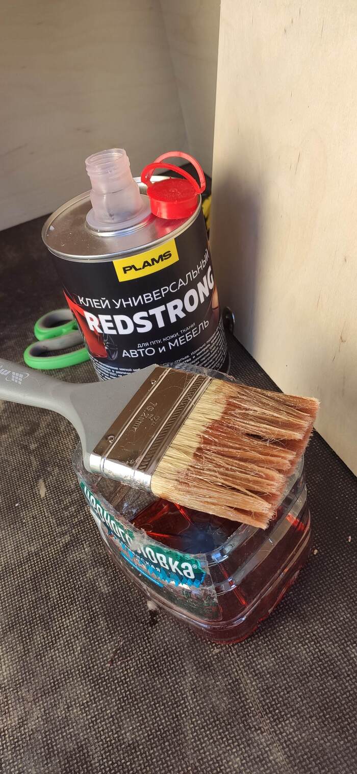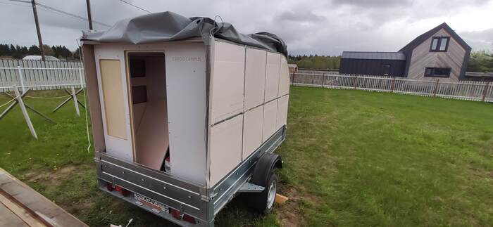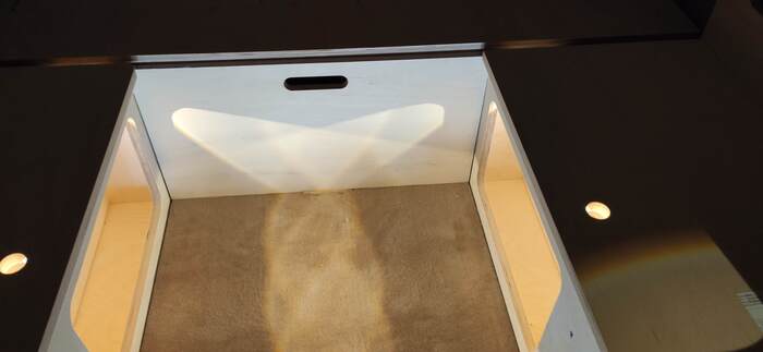 Пришел черед обтянуть карпетом фанеру каркаса, для придания уюта жилому объему. Карпет выбран на основе многочисленных отзывов, как наиболее приятный материал для работы и дальнейшей эксплуатации. Правда традиционный серый цвет карпета нагонял тоску. Оказалось, что также выпускают его и в бежевом цвете, как раз под тон фанеры должен подойти, подумал я и заказал рулон в 10 метров, с запасом, и литровую банку мебельного клея. Забегая вперёд, скажу, что запас карпета очень пригодился, т.к. не обошлось без косяков. Примерно метр ткани ушел с траектории и пришлось его отдирать и утилизировать. Нужно отдать должное профессиональному клею, работать с ним очень приятно и приклеивает надёжно)). В завершение установил аккумуляторную подсветку с USB зарядкой. Результаты очень радуют, внутри стало прям очень уютно.