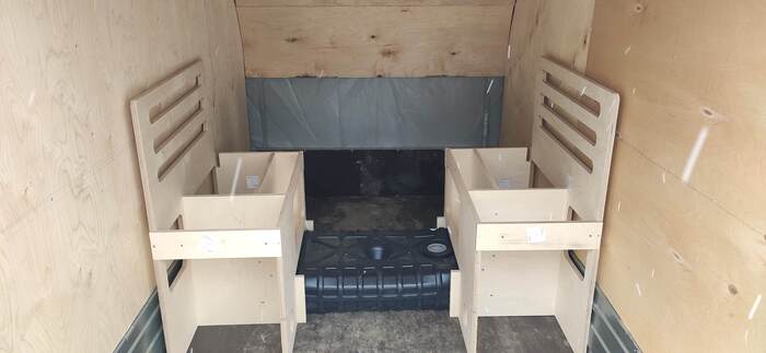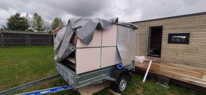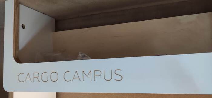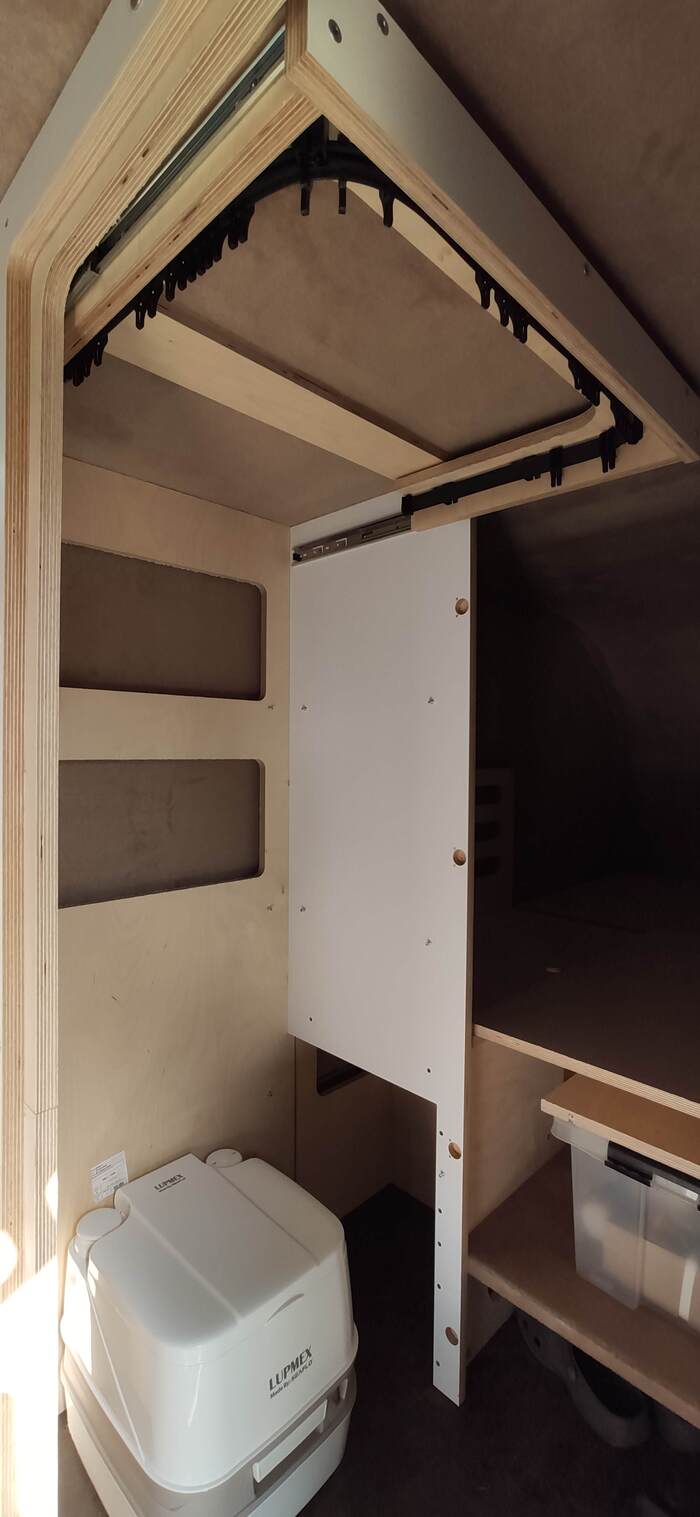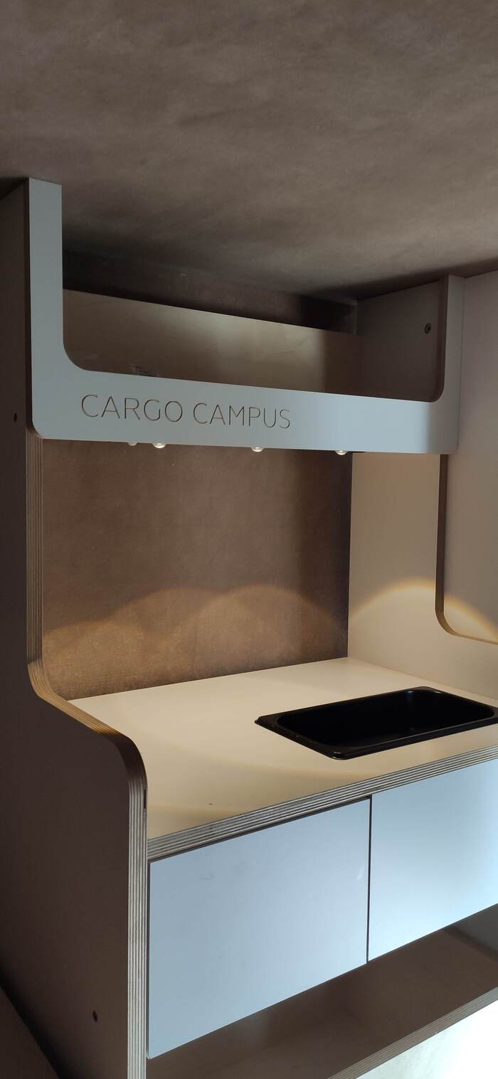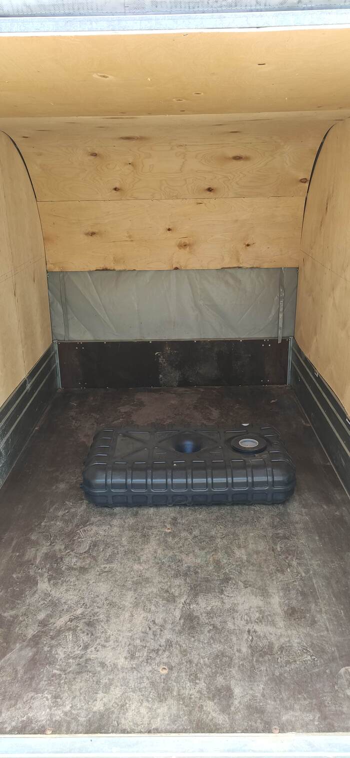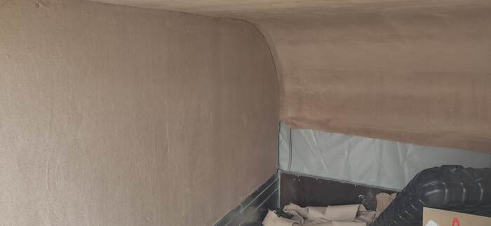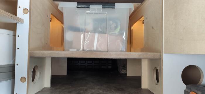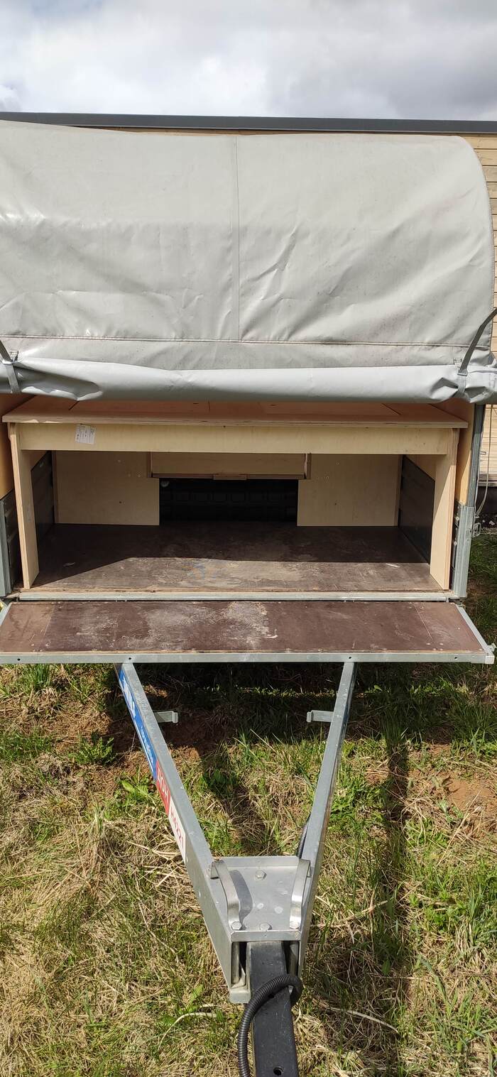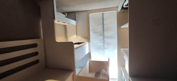 Пришел черед обтянуть карпетом фанеру каркаса, для придания уюта жилому объему. Карпет выбран на основе многочисленных отзывов, как наиболее приятный материал для работы и дальнейшей эксплуатации. Правда традиционный серый цвет карпета нагонял тоску. Оказалось, что также выпускают его и в бежевом цвете, как раз под тон фанеры должен подойти, подумал я и заказал рулон в 10 метров, с запасом, и литровую банку мебельного клея. Забегая вперёд, скажу, что запас карпета очень пригодился, т.к. не обошлось без косяков. Примерно метр ткани ушел с траектории и пришлось его отдирать и утилизировать. Нужно отдать должное профессиональному клею, работать с ним очень приятно и приклеивает надёжно)). В завершение установил аккумуляторную подсветку с USB зарядкой. Результаты очень радуют, внутри стало прям очень уютно.