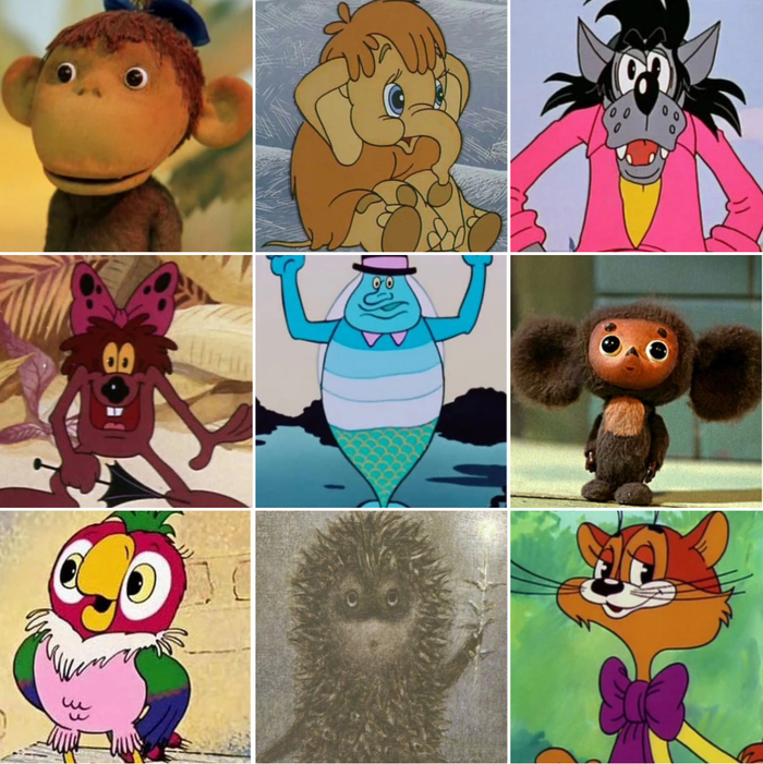 тут изображен один из следующих героев: ежик в тумане, водяной, коты Леопольд и Матроскин, волк из Ну Погоди, Громозека, попугай Кеша, Дюдюка Барбидокская, Чебурашка, Мартышка из 38 попугаев, мамонтенок, Крошка Енот, Сова из Винни-Пуха, Мойдодыр, Паровозик из Ромашкова, поросенок Фунтик, Ежик из Трям, Львенок, певший с Черепахой.