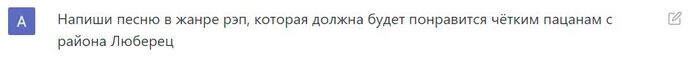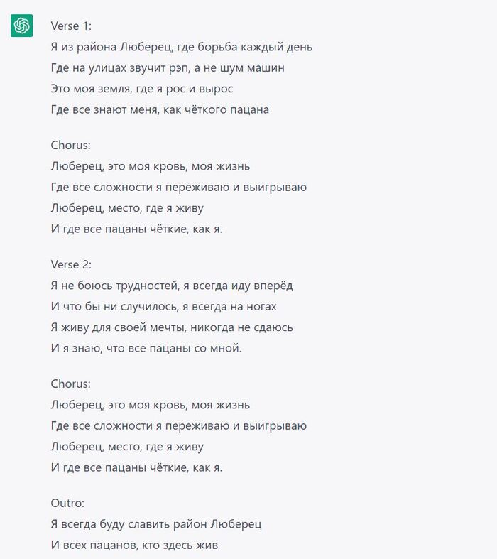 7 DIAL1 Нейросети пишут рэп Серия ChatGPT 2 года назад Продолжаю баловаться с нейросетями, на этот раз попросил написать гангста-рэп и всё оказалось даже смешнее чем я ожидал) Скоро из во всех магнитофонов девяток xD Показать полностью 1 [моё] Нейронные сети ChatGPT Openai Текст песни 1 Ещё 0