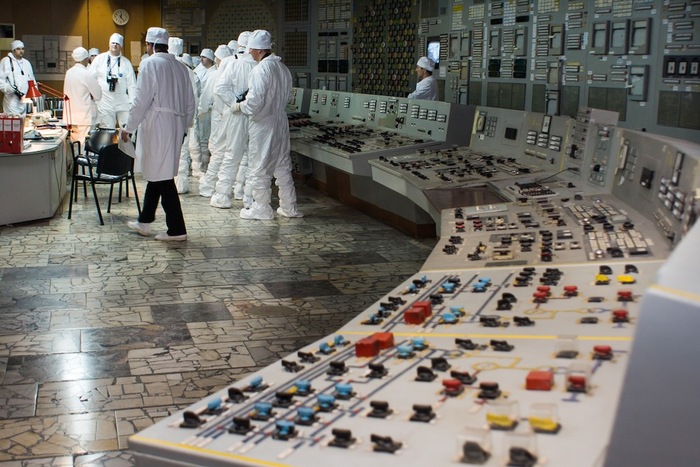 Дальше посетили БЩУ. Кажется, это был БЩУ-3, идентичный тому, с которого управлялся четвертый блок в роковую ночь. На фотографии - вид на рабочее место ВИУР с мнемотабло каналов и сельсинами. Справа можно увидеть телевизор, по которому показывают РЦ