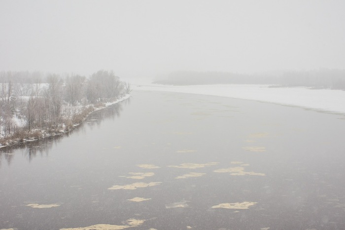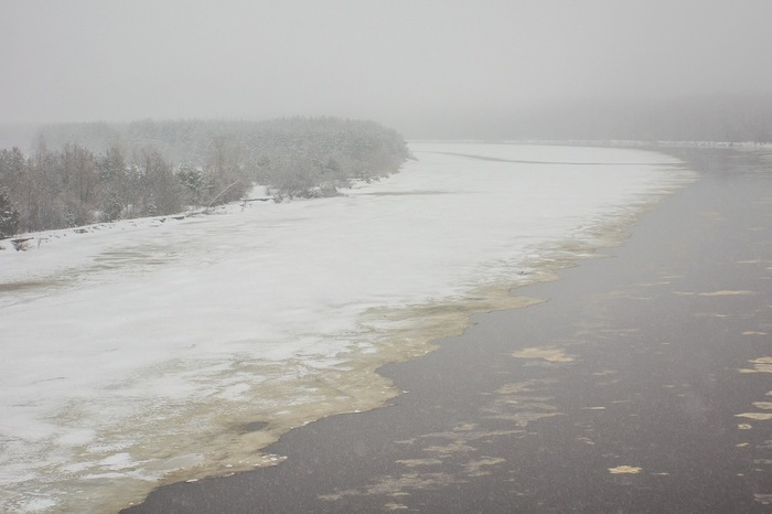 Быстрая местная река. Можно заметить начинающийся снегопад, который наш надежный план разрушит :)
