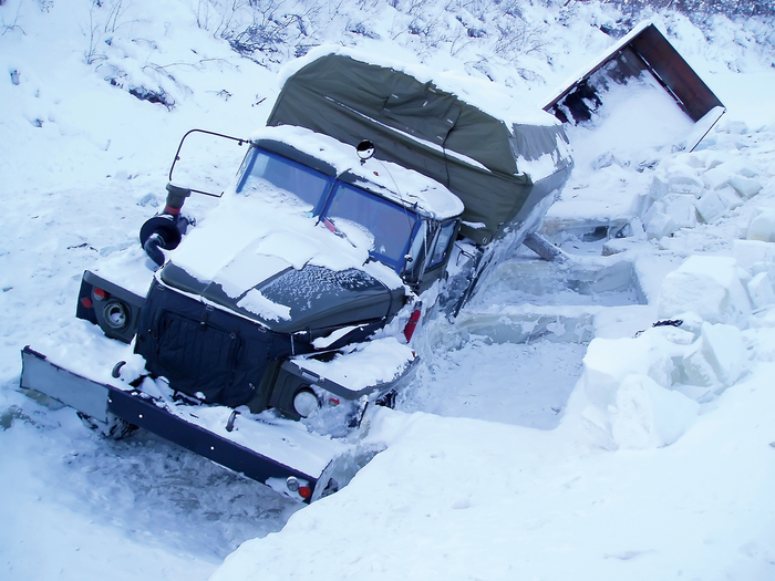 Наледь. Это вода, которая выступает на поверхность льда из-за трещин под давлением и тут же замерзает тонкой коркой, создавая под собой водяную линзу. Тяжелый грузовик легко проламывает верхнюю корку и мгновенно вязнет.