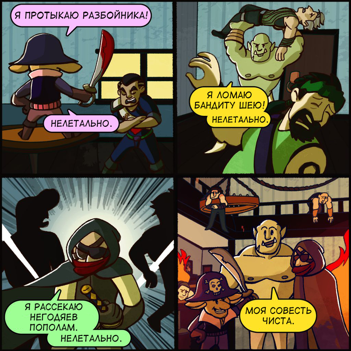 * "Мой персонаж не стал бы так поступать" - D&D это ролевая игра. И опытные игроки создают себе персонажей, которые могут кардинально отличаться от них самих по характеру, тем самым, игрок как бы переживает все события от лица совершенно другого человека. Персонажи могут иметь свои уникальные черты. Например, скорее всего здесь имеется в виду что усатый парень боится воды или ненавидит орков, считая их порождением зла, поэтому в такой игровой ситуации его персонаж действительно не стал бы предпринимать никаких действий.