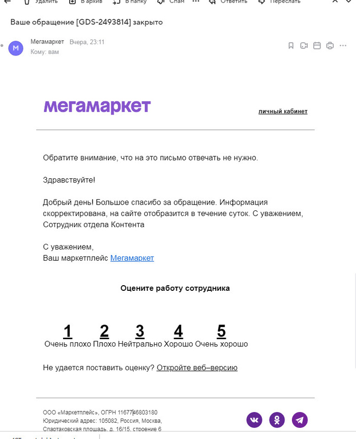 Но мегамаркет не упускает шансов ещё и поглумиться напоследок! Дней через 10 после первого обращения в поддержку получаю письмо!