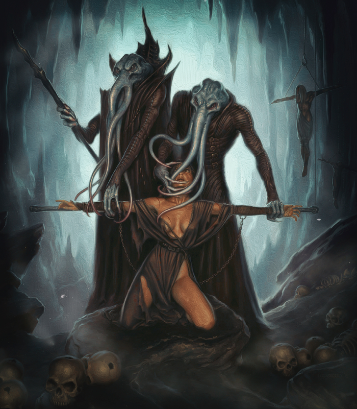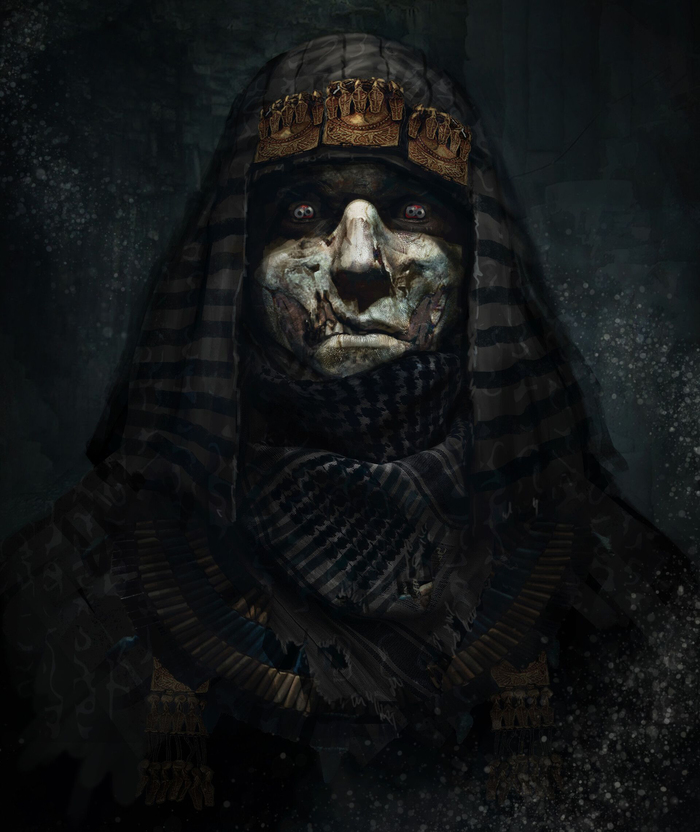 Тамас подошел к женщине, что явно чего-то ожидала и читала книгу. Она с ним заговорила и сказала, что наблюдала за какими-то “хорошими экземплярами” (я не понял о чем она говорила). Солмир отвлек Тамаса от разговора, указав на срочность задания, и мы зашли в здание. Вонь усилилась, темная комната была заставлена столами с гробами и инструментами для их изготовления, в дальнем углу сидела полуголая фигура, вокруг которой кружились мухи. Когда фигура повернулась к нам лицом, стало понятно, что перед нами гуль, любые разговоры с которым были бесполезны. Хорт, сквозь прикрытое лицо ладошкой, прокричал, что вонь была от этого существа.