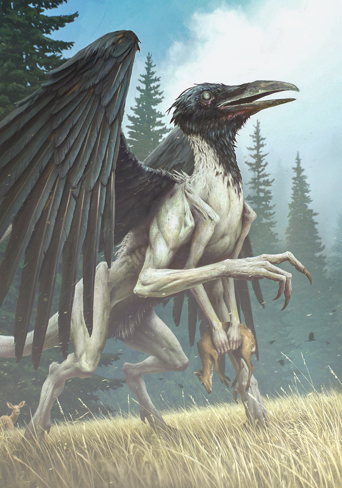 Официант не заставил долго ждать и быстро принес нам выпивку и еду, но наше внимание привлекла необычная фигура, плавно спускающаяся со второго этажа трактира. Это был ааракокра (Ааракокра - живущие в изоляции высоко в горах на вершинах самых высоких деревьев, ааракокры, называемые иногда «птичьим народом», вызывают страх и удивление. Многие ааракокры даже не являются уроженцами Материального Плана. Они родом из мира, находящегося очень далеко — с бескрайних просторов Стихийного Плана Воздуха. Это иммигранты, беженцы, разведчики и исследователи, а их форпосты служат им плацдармом в неизвестном и чужом мире), внешним видом напоминая ястреба или сокола с человеческой формой тела, я о таких только слышал. Он медленно спланировал на пол возле барной стойки и заказал себе молока.