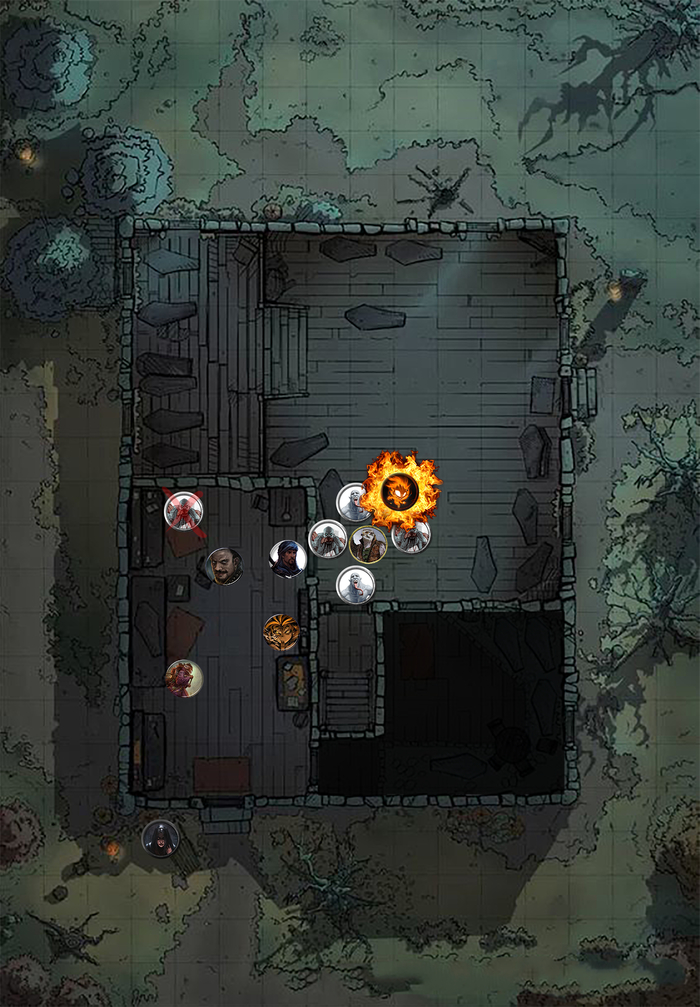 Как только птичка попала за дверь на ее запах набежали монстры (3 гуля и 2 вурдалака). Тамас с испугу выстрелил через дверной проем в одного из вурдалаков. Орума быстро окружили, перекрыв проход. В то время, как он мастерски уворачивался от града ударов и кусей упырей, Солмир закрыл своей широкой спиной дверной проем, чтобы уберечь меня, Хорта и Тамаса от зловонных.