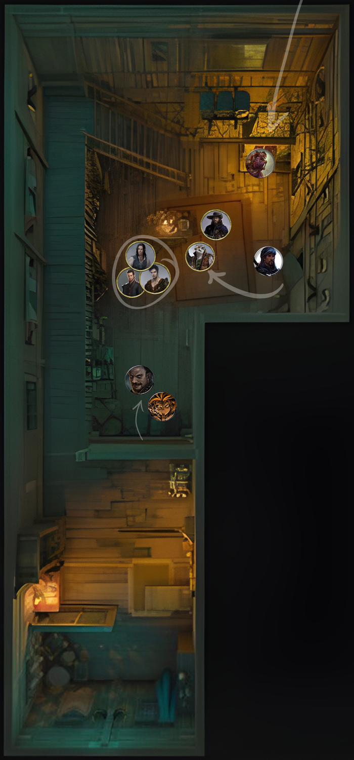Внутреннее помещение внешне напоминало обычную таверну: барная стойка, несколько столов, постояльцы распивали напитки и прочее. В центре таверны был большой колодец, над которым висел деревянный мост с двумя сражающимися парнями. Я также заметил, что помимо простый горожан, здесь были и люди в масках клоунов. Зальтебар повел нас к отдельной лестнице. В этот момент, один из парней с криками упал с моста прямо в глубокий колодец и после чего раздался смачный шмяк.