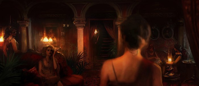 Общий зал борделя был полон очаровательными полуголыми девицами, некоторые из которых мило общались и выпивали с посетителями, а другие ожидали своих клиентов. Приглушенный свет и красные тона стен и мебели придавали этому месту особое настроение.