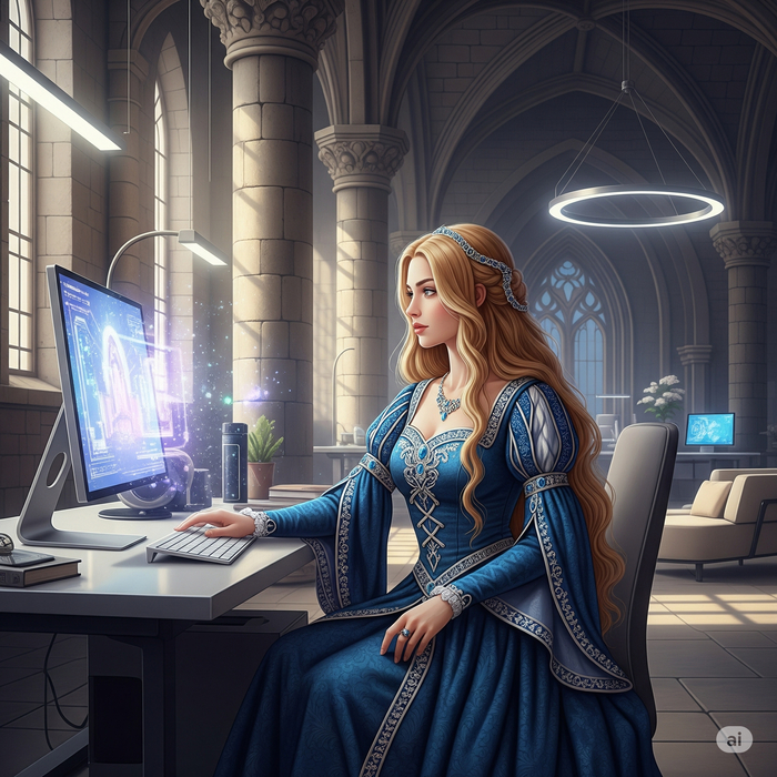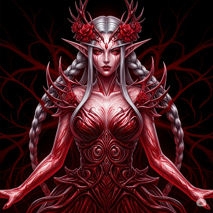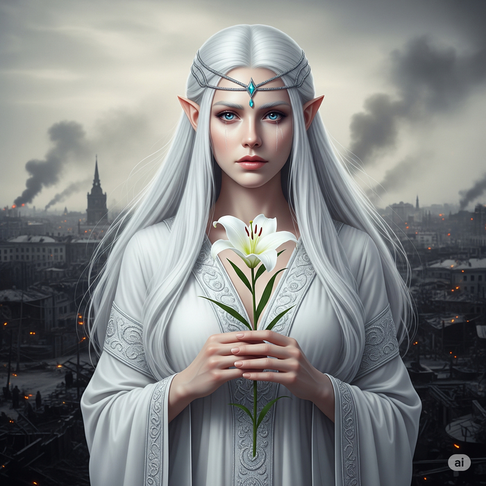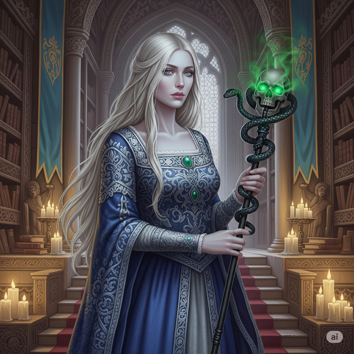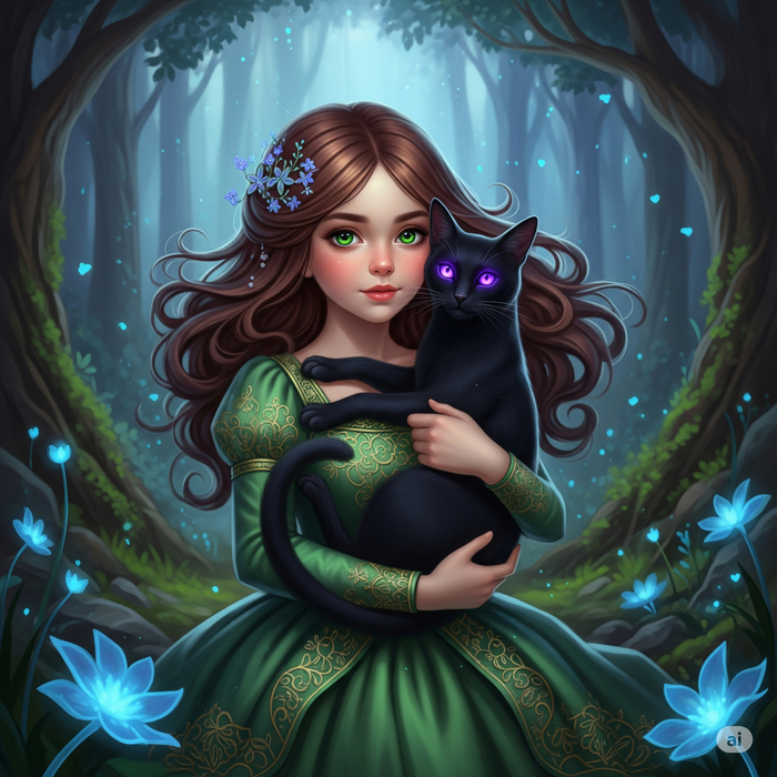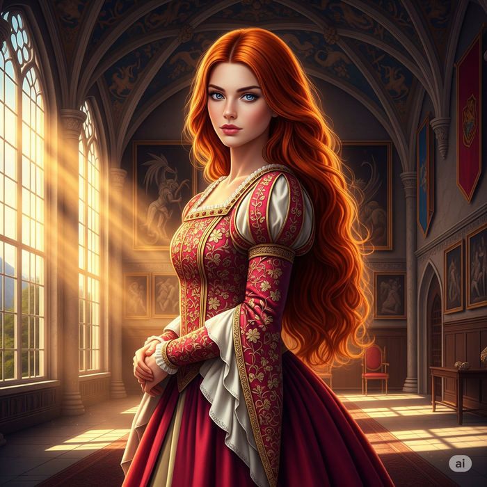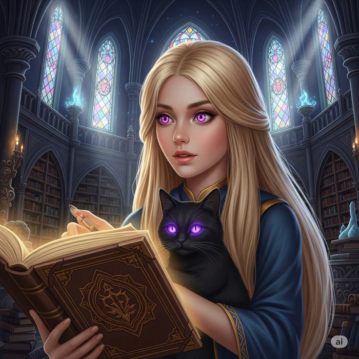 или: Нарисуй арт в стиле картины Леонардо да Винчи Дама с Горностаем но у дамы пусть волосы будут платиновые а глаза красные а вместо горностая пусть будет цифровой кот