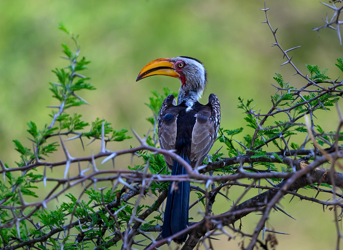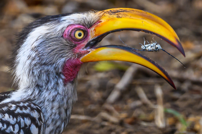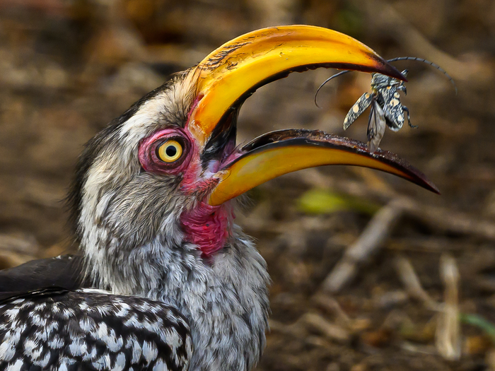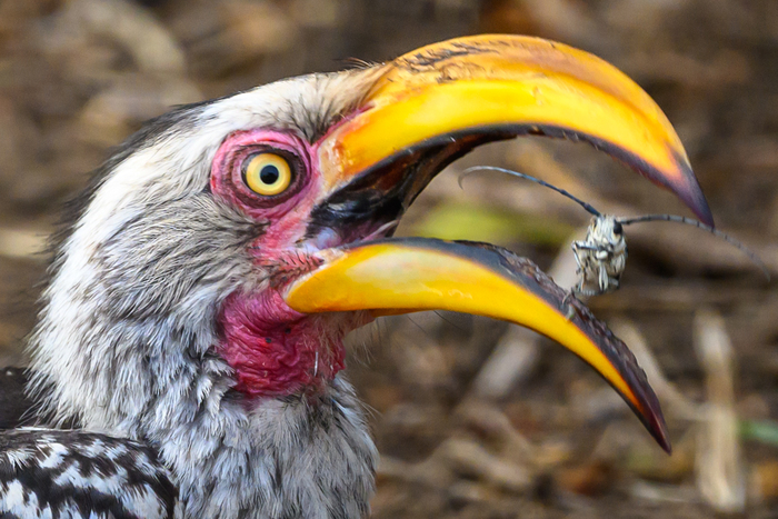 Желтоклювый токо поймал жука и ломает ему хитиновый панцырь своим мощным клювом, это продолжалось секунд 30, он подбрасывал жука в воздух, ловил, пережевывал мощным клювом и в итоге съел.