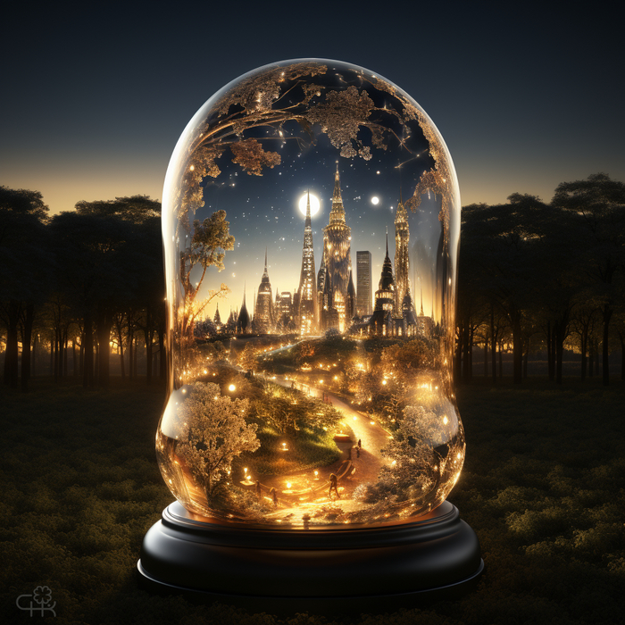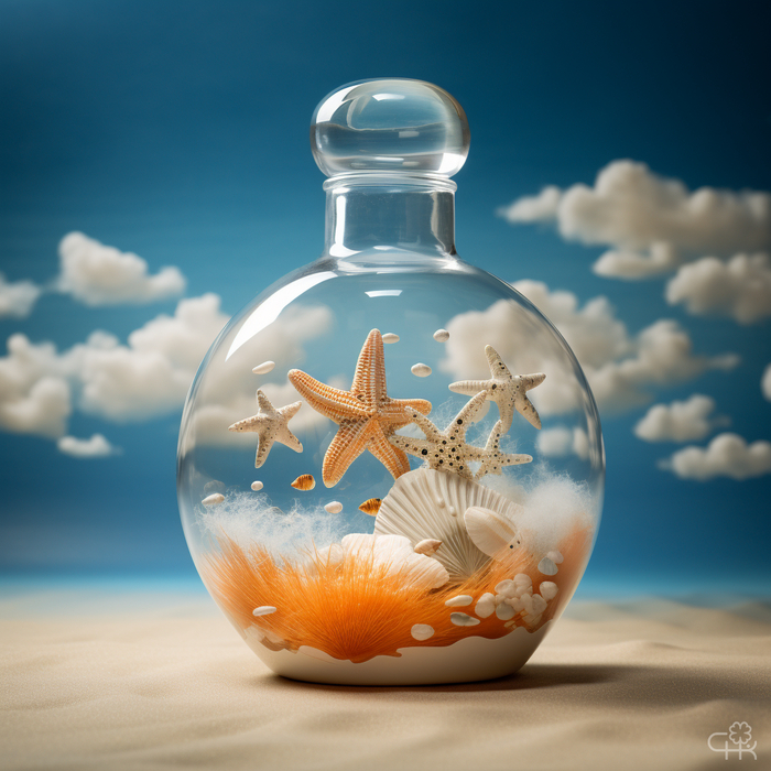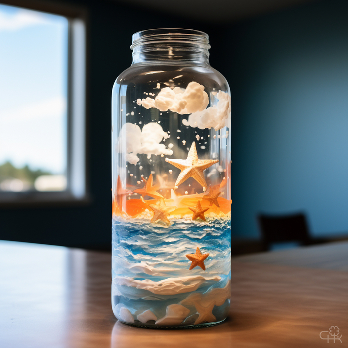 Промпт: sky, white clouds and an orange starfish in a glass bottle.