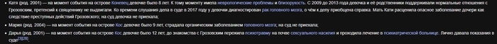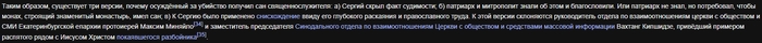 Но разбор полётов произошёл спустя целых девятнадцать лет. Здесь же говорится о сокрытии Романовым факта убийства и об отсутствии справки о судимости. И вот что интересно: никто из высокопоставленных служителей церкви не додумался отправить в колонию запрос с целью проверки факта судимости. И действительно, сидел или не сидел, кому какое дело? Главное о боге постоянно думать... И в конце абзаца упоминаются аж три официальные жены Романова и его дочь. И это на церковь не произвело никакого впечатления... В следующем абзаце приводятся аж три версии получения сана священнослужителя Романовым: