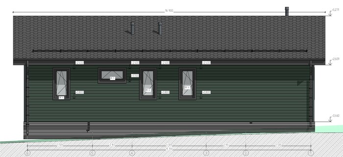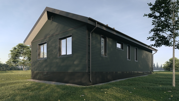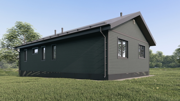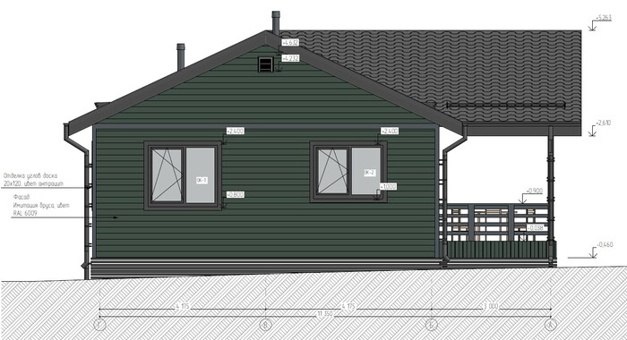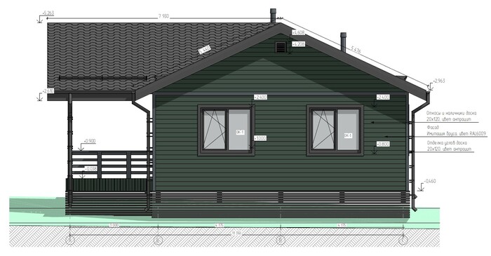 Далее установили окна и приступили к монтажу фасадной доски. Но перед этим смонтировали цокольные ПВХ-панели. Фасадная доска с поднятым ворсом покрашена на производстве в цвет RAL6009 (елово-зелёный). В зависимости от освещённости имеет разный оттенок. Я уже выкладывал пост, где подробно рассказывал про такой вид отделки (Лучшая отделка каркасного дома).