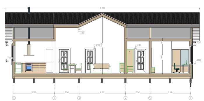 Внутренняя отделка также крашенная на заводе имитация бруса на стенах и вагонка штиль на потолке в зоне второго света кухни-гостиной, на полу фанера 18 мм. В санузлах и техническом помещении черновой пол листы ЦСП, на стенах влагостойкий гипсокартон.