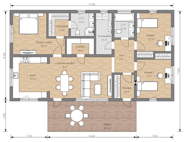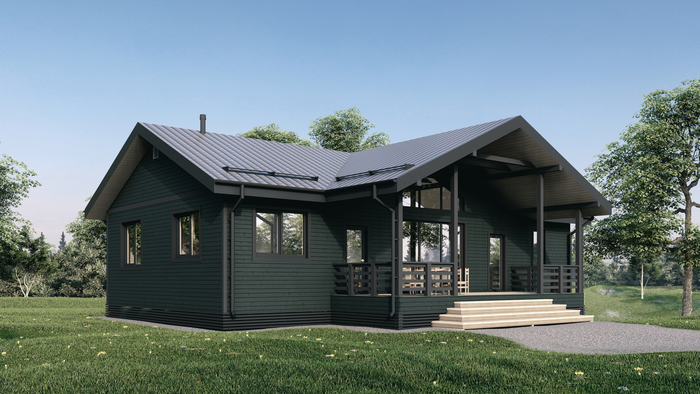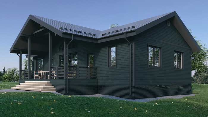 Окончательный вид дома. Дом получился просторным. В нем большая кузня-гостиная 37 м2, хозяйская спальня с собственной гардеробной и санузлом, две детские по 13 м2, еще один санузел, котельная и кладовая.