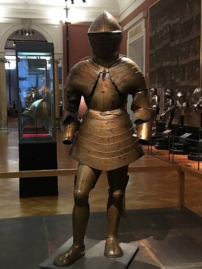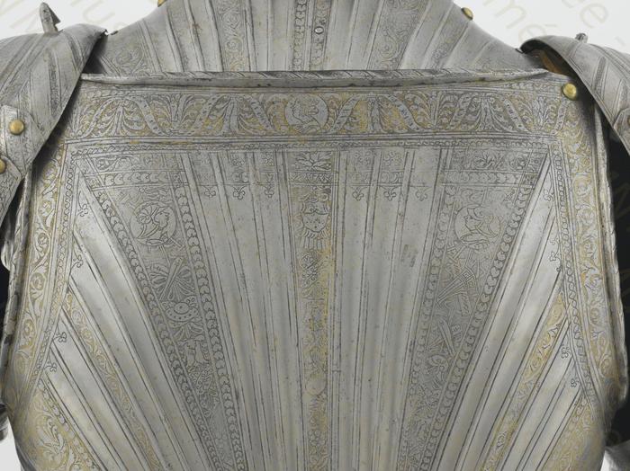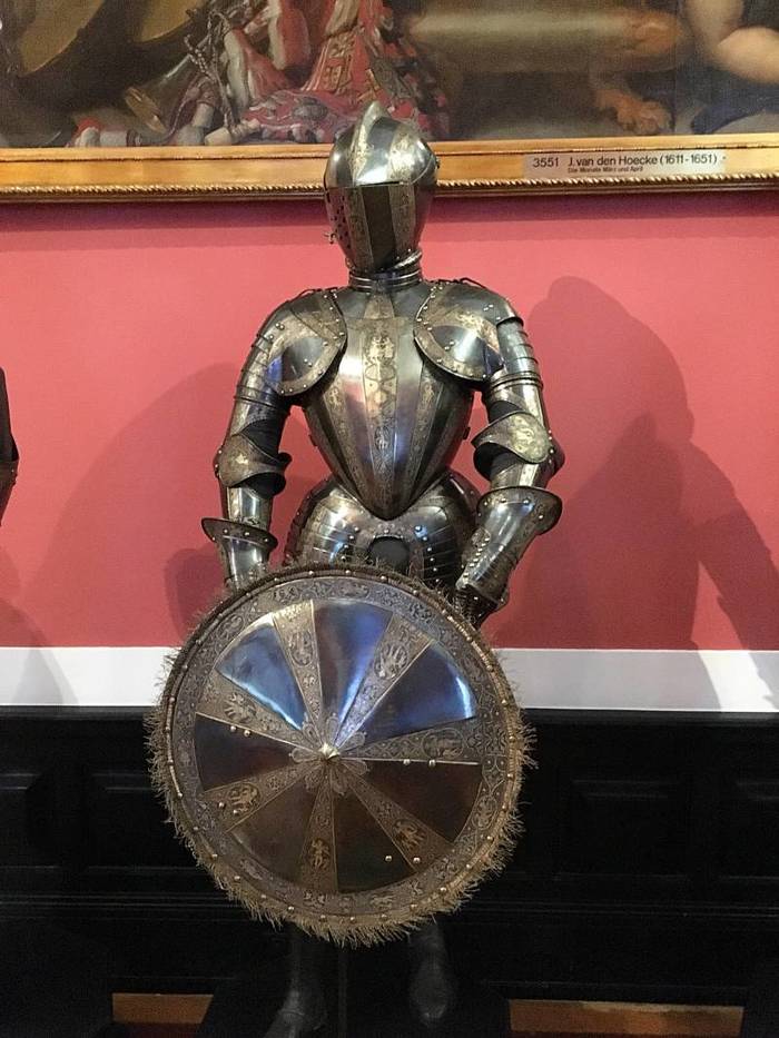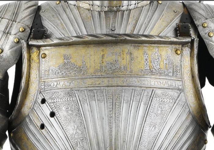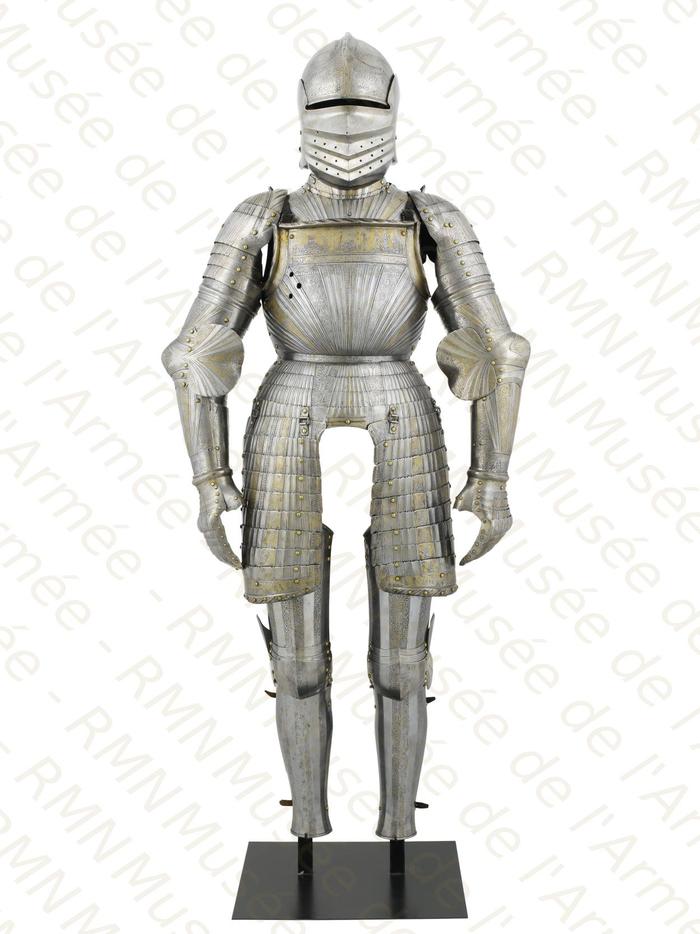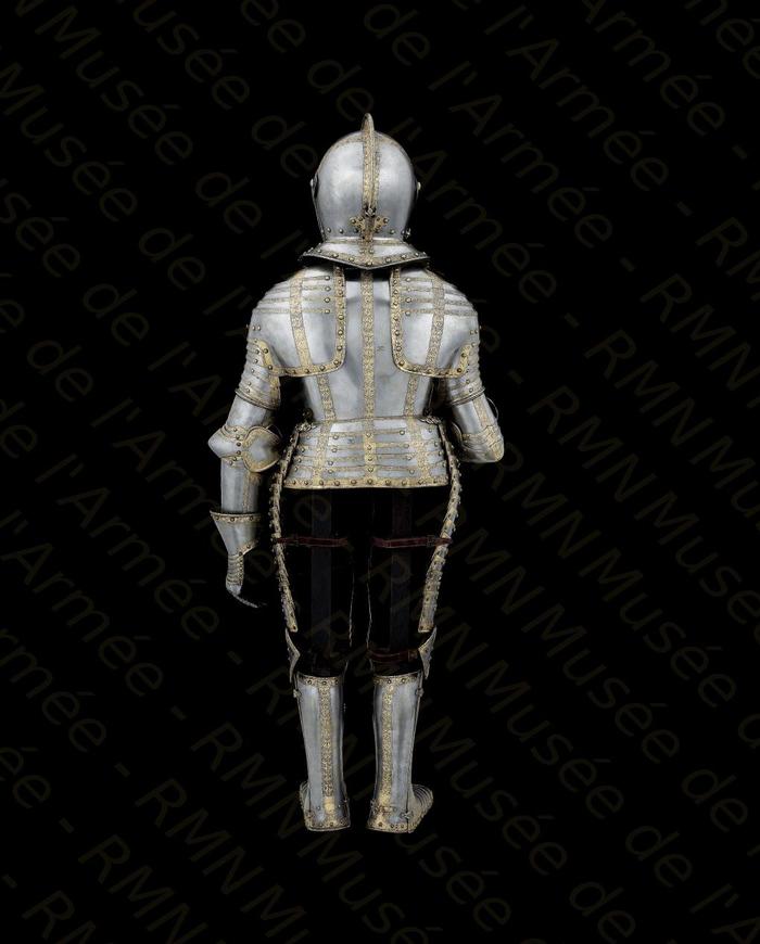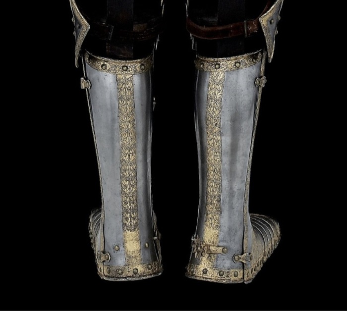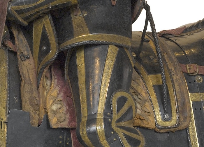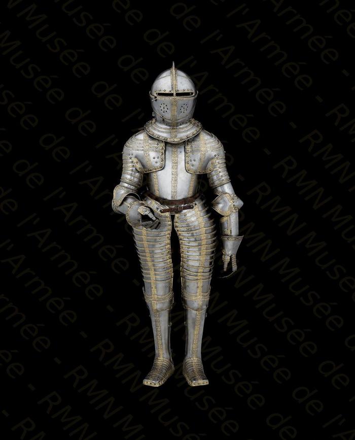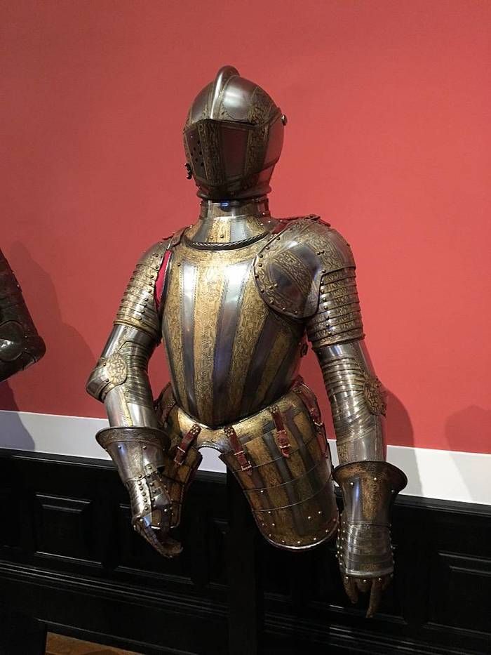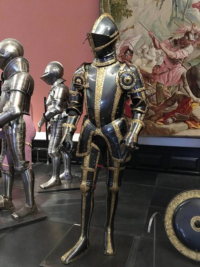 Перед нами доспех Филиппа II. Император Карл V заказал его в 1544 году как часть великолепного «Великого гарнитура» для своего сына Филиппа II Испанского. Доспех изготовили мастер Дезидериус Хельмшмидт и аугсбургский гравер Ульрих Хольцманн. Доспех очень тонко украшен широкими черными протравленными продольными полосами в виде узора из переплетенных завитков и листвы, который сопровождается узкими полосами, наведенными золотом. На доспехах выгравирована дата "1544". Известен как муж королевы Марии-католички, дочери Генриха VIII. После отречения отца в 1555 году, он стал его преемником в Нидерландах и Милане, а в 1556 году сделался королем Испании, Неаполя, Сицилии и «обеих Индий». В 1580 году он наконец-то стал еще и королем Португалии. Экспонируется доспех в зале №3. Изготовители: Дезидериус Хельмшмидт (1513 – 1579 гг, Аугсбург), Ульрих Хольцманн (травление) (в 1534 – 1562 гг, Аугсбург). Материалы и технологии: «белый металл», позолота, травление, чернь, латунь, кожа