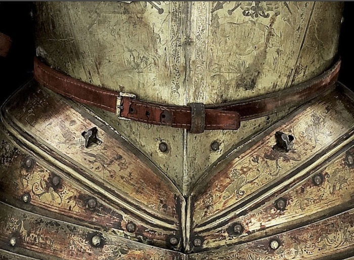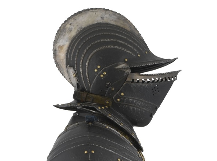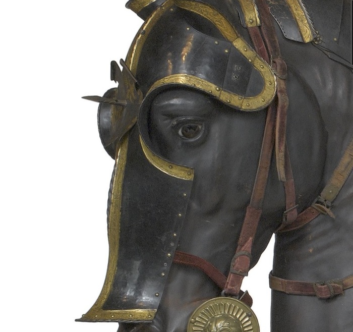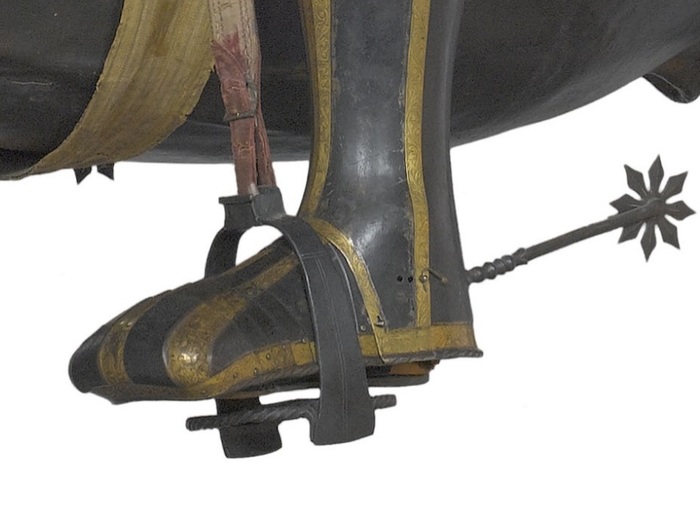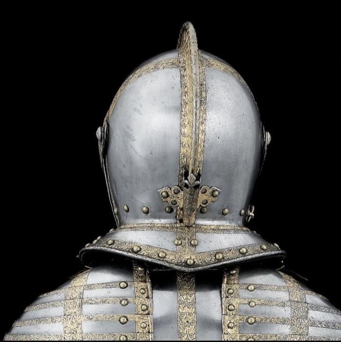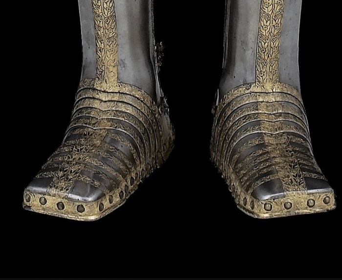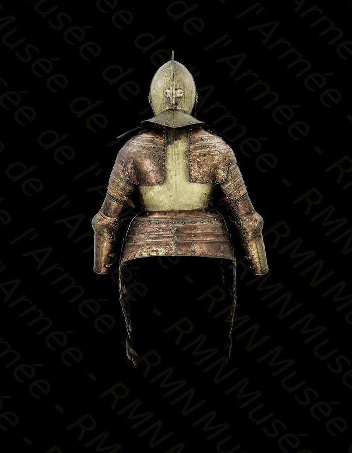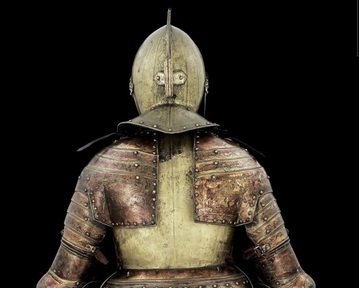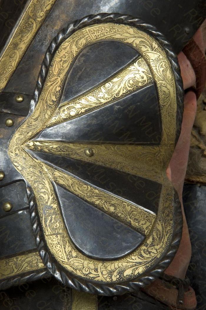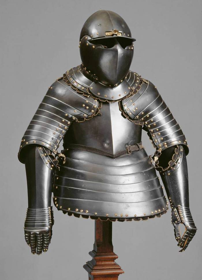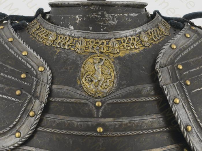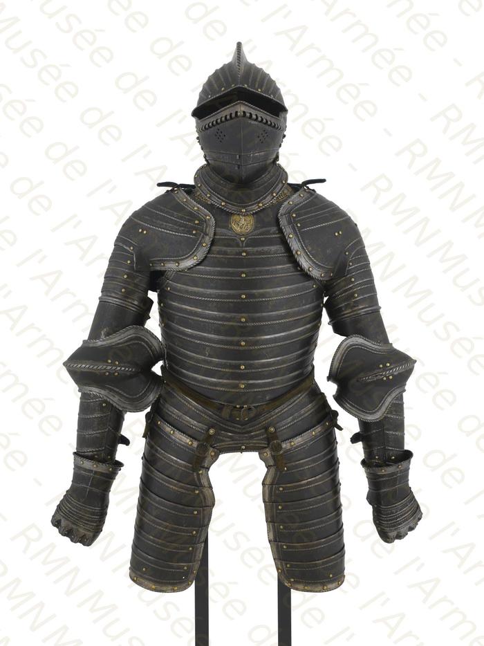 Перед нами доспех Филиппа II. Император Карл V заказал его в 1544 году как часть великолепного «Великого гарнитура» для своего сына Филиппа II Испанского. Доспех изготовили мастер Дезидериус Хельмшмидт и аугсбургский гравер Ульрих Хольцманн. Доспех очень тонко украшен широкими черными протравленными продольными полосами в виде узора из переплетенных завитков и листвы, который сопровождается узкими полосами, наведенными золотом. На доспехах выгравирована дата "1544". Известен как муж королевы Марии-католички, дочери Генриха VIII. После отречения отца в 1555 году, он стал его преемником в Нидерландах и Милане, а в 1556 году сделался королем Испании, Неаполя, Сицилии и «обеих Индий». В 1580 году он наконец-то стал еще и королем Португалии. Экспонируется доспех в зале №3. Изготовители: Дезидериус Хельмшмидт (1513 – 1579 гг, Аугсбург), Ульрих Хольцманн (травление) (в 1534 – 1562 гг, Аугсбург). Материалы и технологии: «белый металл», позолота, травление, чернь, латунь, кожа
